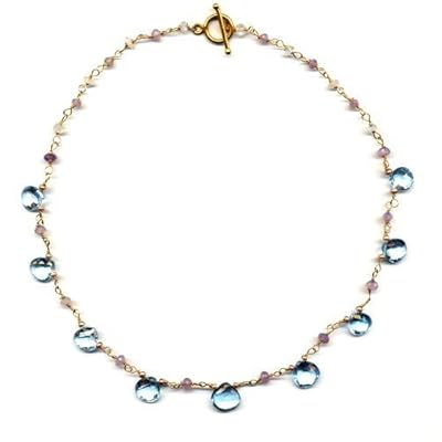 Another example of one of Suz Andreasen's stunning Briolette necklaces. These gems are chocked full of sparkle and would make a great gift for that March baby. Measuring in at 17 inches it is glamorous and effortless all at once. Made from 14K Gold she used small seed pearls along with lavendar chalcedony to give it that extra punch.