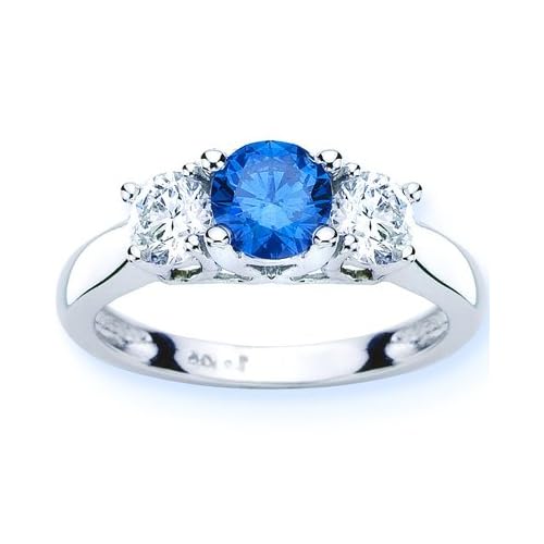 This 14k white gold diamond ring is prong set with 1 round blue diamond and 2 round white diamonds. The total carat weight is 1.50 cts. The diamonds are blue color and VS clarity.