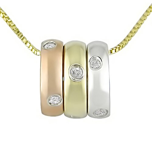 Three diamond-accented rings, in 14 karat yellow, white, and rose gold, are threaded along a smooth yellow gold box chain in this captivating design. The rings have a bright polished finish and hold a total of 12 genuine diamonds (1/8 cttw) in invisible settings. The slender, brightly polished box chain measures 18 inches and fastens with a spring ring clasp. A beautiful twist on the notion of a diamond ring, this pendant makes a very special gift. It's three-tone design makes it easy to pair with any outfit or jewelry metal.