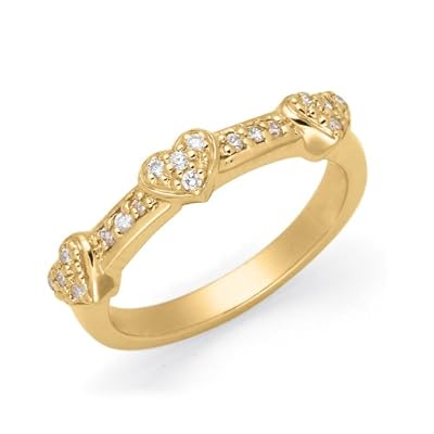 Demonstrate your love with this charming and original diamond heart band, crafted from 14 karat yellow gold. The perfect gift for an anniversary or special occasion, it features three small raised hearts, evenly spaced across the top of the band. Each heart holds four round diamonds in shared prong settings. Additional diamonds are featured along the band between the hearts, for a total of 18 diamonds altogether. The polished bead-like prongs have a rounded surface and are slightly recessed to maintain a smooth, snag-resistant line. A smooth, polished interior gives this ring a comfortable feel against the skin. A custom jeweler will be able to size the ring within a 1/2 size. It is a normal process to then tighten the settings to ensure the stability of your gemstones.