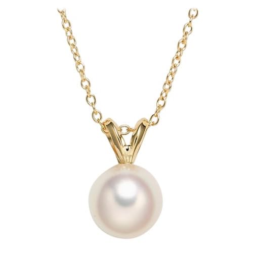 This captivating cultured pearl pendant has a timeless design. It features a round, lustrous Akoya cultured pearl attached to a V-shaped bale of polished 18 karat yellow gold. The pendant falls just below the throat and hangs from a delicate 18 karat gold cable chain that fastens with a lobster-claw clasp. The highest standard of quality for gold jewelry, 18 karat gold provides excellent color and superb durability.