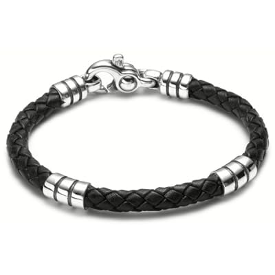 From Zina's Stratus Collection comes this handsome bracelet in braided leather and sterling silver. Satin-finished silver rings with oxidized ridges accent the thick black rope of braided leather. Matching silver caps finish the bracelet, and an oversized lobster-claw clasp gives it a masculine look. This is the perfect accessory to pair with denim or leather for a modern urban casual look.