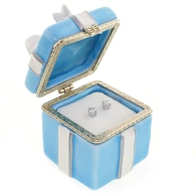 A pair of sparkling diamond stud earrings makes a thrilling gift. These diamond studs are classic and sophisticated, with single round-cut diamonds mounted in secure four-prong settings of gleaming 14 karat gold. The diamonds have a total weight of one full carat, and a good cut, with minimum I color and I3 clarity. Threaded posts with screw-on backings create a comfortable and secure fit, and prevent worries over lost earrings. This dazzling pair is packaged in a beautiful robin's egg blue ceramic gift box, complete with ceramic bow.
