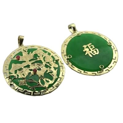 Green Jade Greek Key Occupied Birdhouse Pendant with Ruby Eyes, 14k Gold. This special version of the Occupied Birdhouse Pendant comes with a few extras: ruby eyes, solid gold Greek Key bezel, and the chinese character for "Fortune" on the back which makes this pendant reversible. Because the stones are real and hand-cut, the actual item may appear slightly different than pictured.